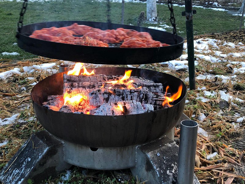 Das ist der Boden von einem alten Schaumtank aus der Reinigungsmittelbranche. Der Edelstahltank wurde aufgeflext nachdem die alte Stahlfeuerschale durchgerostet war. Das untere Ende als Schale für den Schwenker, das obere Teil als Assitonne. Hoffe es hält noch 2-3 Jahrzehnte.