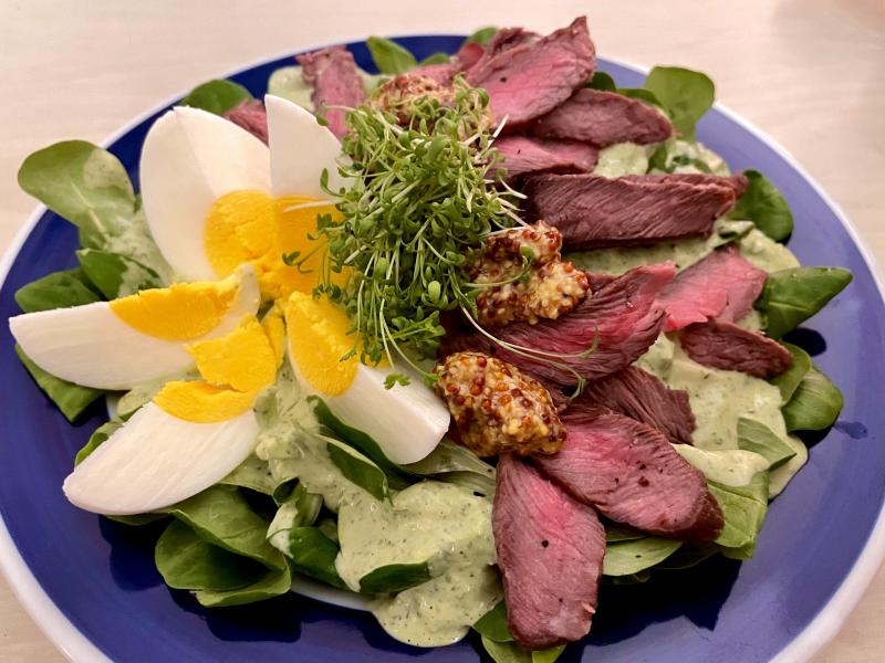 hier gab es nüsslisalat mit frankfurter grüner soße, hühnerei und steakresten à la roastbeef – auch wenn noch nicht gründonnerstag ist, sondern quasi ganz im gegenteil. ;D
