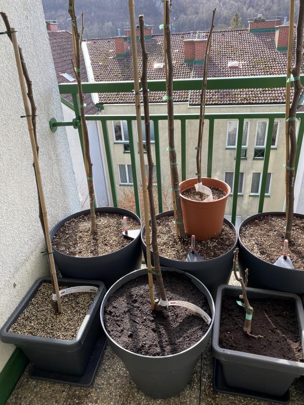Foto: vorne mittig die "Bozener Hausfeige, blau" im Elho Topf. Bereits in ca. 90cm Höhe gekappt zwecks Kronenbildung.