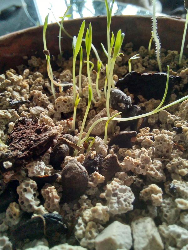 Sollte eigentlich laut Aussaatanleitung erst 2-4 Wochen warm und dann kalt stratifiziert werden, keimt aber jetzt schon in der Wärme (zumindest teilweise).
