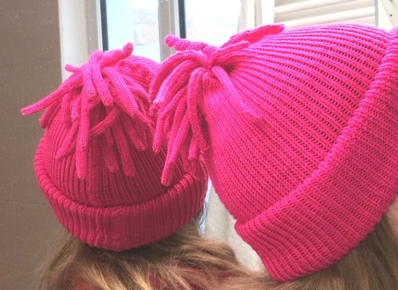 Ich hatte einen pinkfarbenen Schal verschenkt und mir damit eine Bestellung für die passende Mütze eingehandelt. Die Mütze wurde gerade rechtzeitig zur großen Kälte fertig. Der mitbestellte Bommel wurde von mir als Dreadlocks nachgeliefert als es wieder warm war. Solange hat die Mütze ohne Topping ihren Zweck erfüllt.