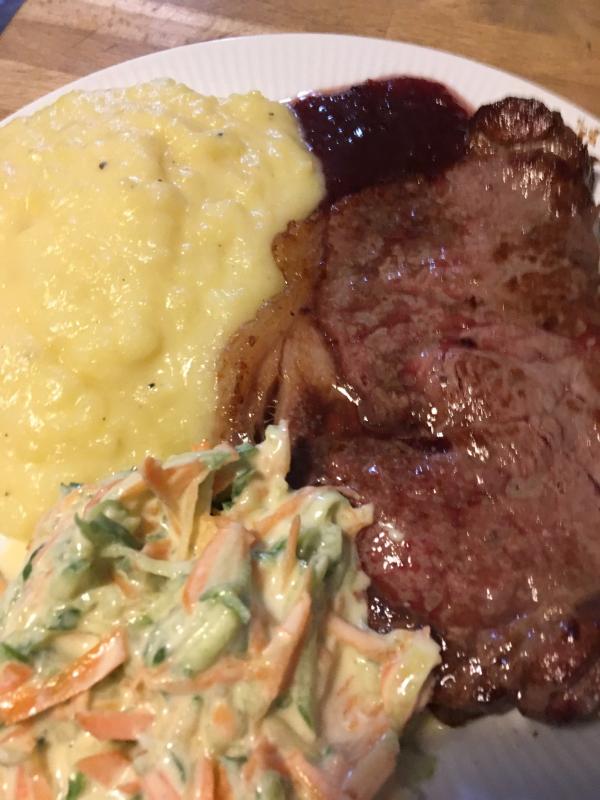 Heute dann Ribeye-Steak, Erdäpfelpüree, Karotten/Gurken-Salat mit Joghurt-Dressing.