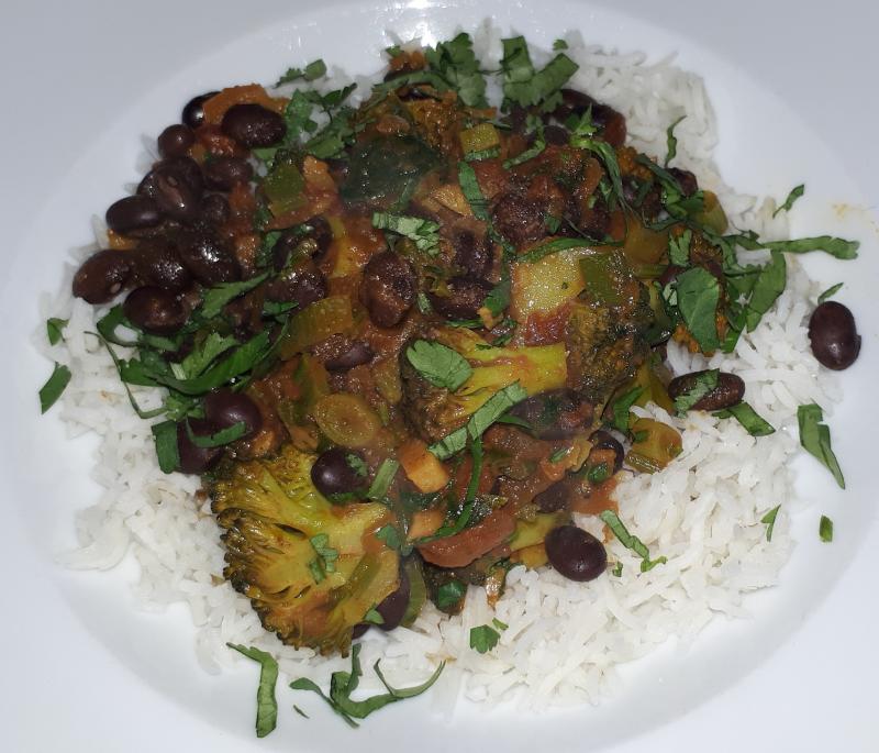 Curry mit Brokkoli und schwarzen Bohnen in einer indisch angehauchten Soße aus Tomaten, Zwiebeln, Ingwer, Knoblauch und frischem Koriander, Basmati, Salat