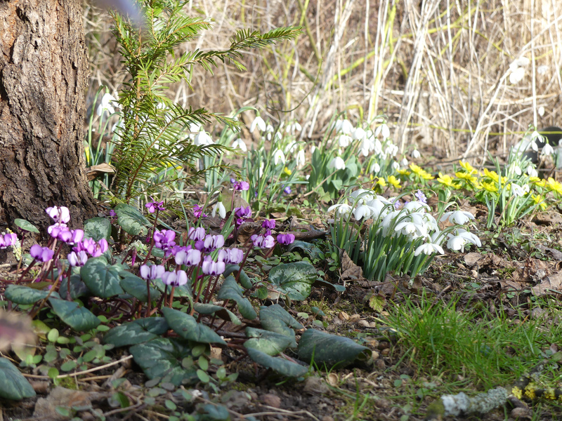 Auch das Zaunbeet erstrahlt nun in gelben und violetten Tönen, und die Schneeglöckchen unten am Gartenhaus - hier ist es selbst im Sommer einigermaßen feucht - sind ebenfalls schon recht üppig geworden und sorgen für eine gute Fernwirkung. Die Lord'schen Märzenbecher scheinen sich dort auch schon etwas vermehrt zu haben. :D