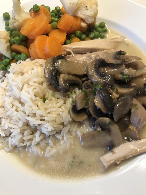 Und heute Hühnerfrikassee mit Reis und ausnahmsweise Gemüse statt Salat dazu