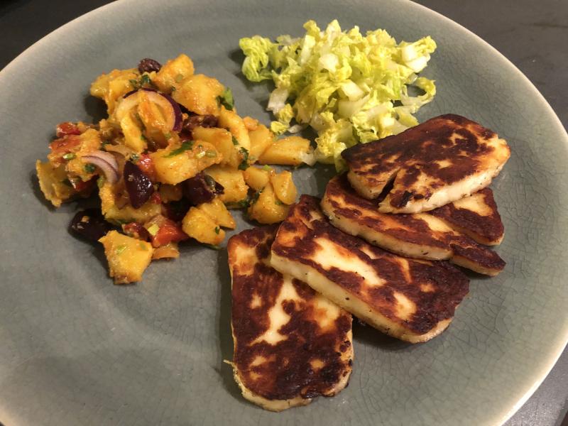 Bei uns gab es heute gebratenen Halloumi mit Salat und orientalisch gewürztem Kartoffelsalat. Harrissa, Oliven, Röstpaprika, Kurkuma, Sardellen, Kapern, Olivenöl, Zitronensaft und Abrieb Salz und Pfeffer.