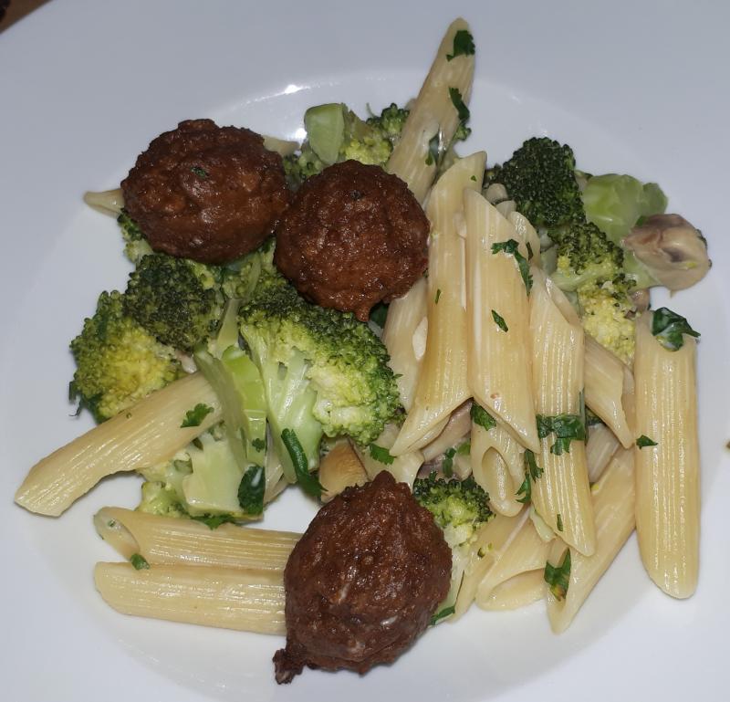 Penne mit Champignons, Brokkoli und Veggie-Bällchen in Käsesoße, Feldsalat mit Tomaten