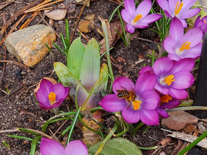 Hier Crocus vernus 'Vanguard' (mit völlig besoffenen Hummeln)
