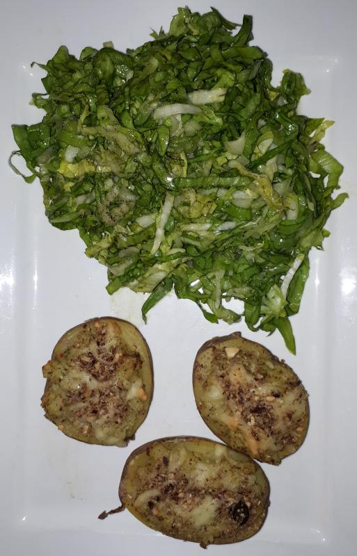 Gefüllte Kartoffeln (Kartoffel, Brokkoli, Quark, Parmesan) mit Bergkäse und gehackten Nüssen überbacken, Endiviensalat