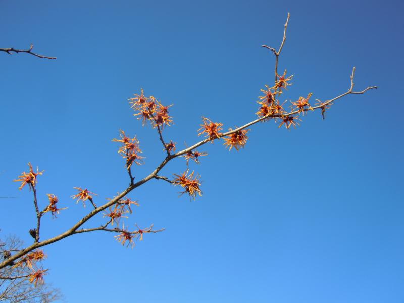 Hamamelis "Aphrodite" leuchtet zusammen mit dem Himmelblau....