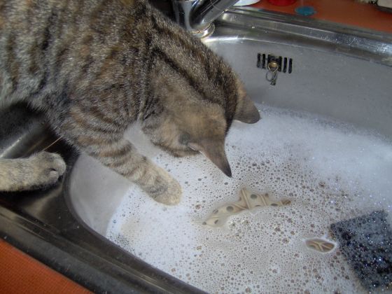 Sohnemann's junge Katze ist heute morgen in einen Eimer mit Biotex gefallen, er war nicht begeisterd