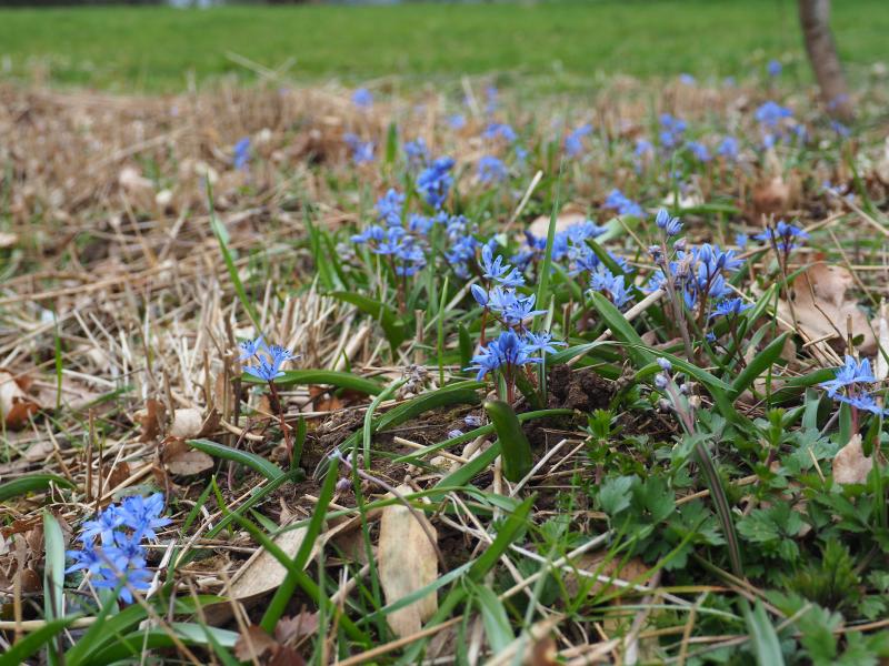 auch zwischen den Stoppeln die Scilla bifolia, ein flächiger Bestand.