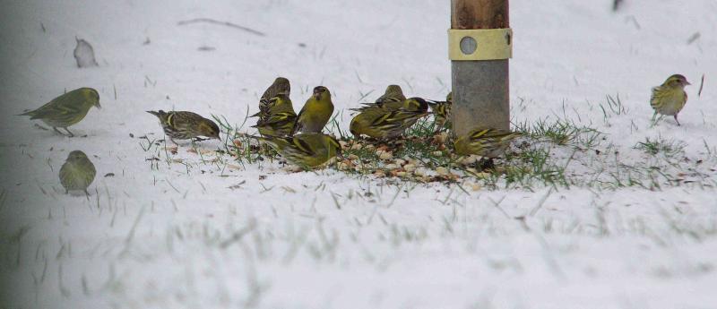 ein Buchfink-Männchen und eine Horde Erlenzeisige (m/w). Ich freu mich auch immer, wenn ein Kernbeißer vorbeischaut :)