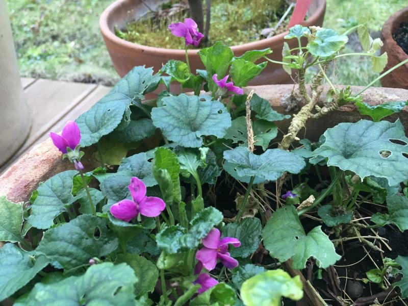 Ich glaube, man sollte die Parmaveilchen jährlich teilen und eventuell auch tiefer pflanzen. Zwei blinde Passagiere habe ich in der ‚Marie Louise‘. Aber ein paar Knospen hat sie. Im Gegenteil zum Comte, der zwar grad austreibt, aber völlig abgefressen war und dem ich auch mehr Frost zugemutet habe, in der Hoffnung, dass dieses Viech stirbt. Was immer da auch frisst.