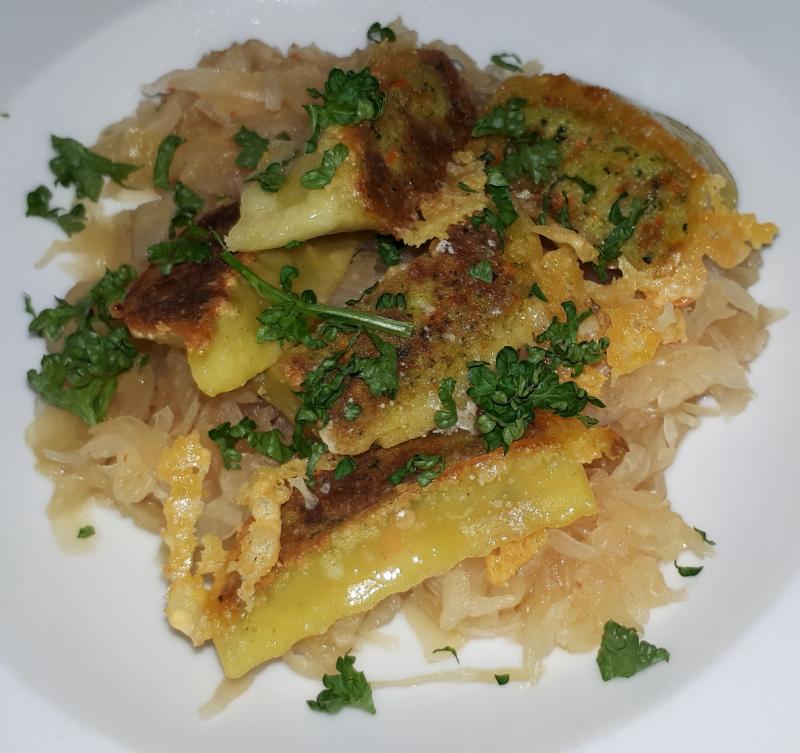 Mit Parmesan gebratene, vegetarische Maultaschen auf Sauerkraut, Endiviensalat