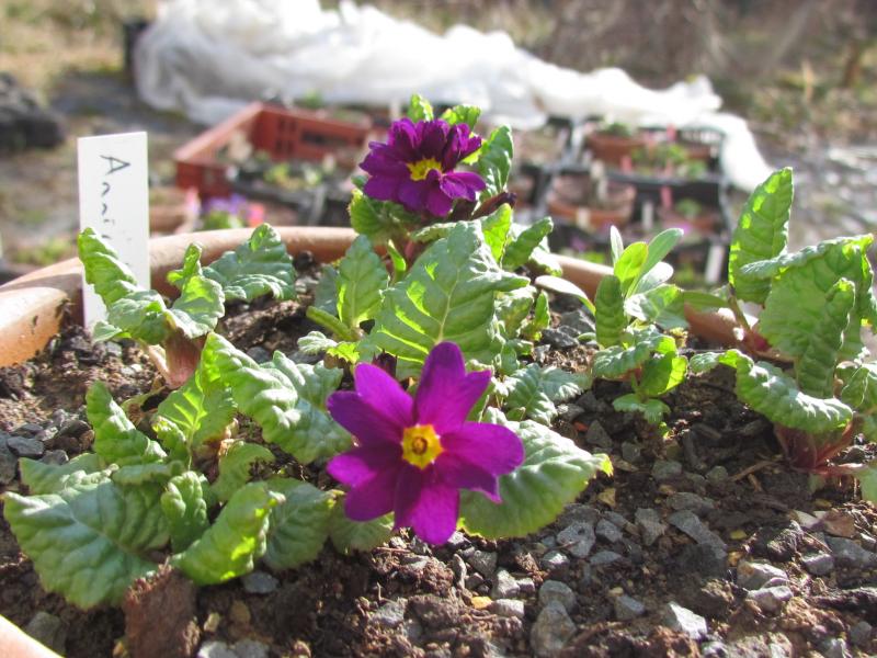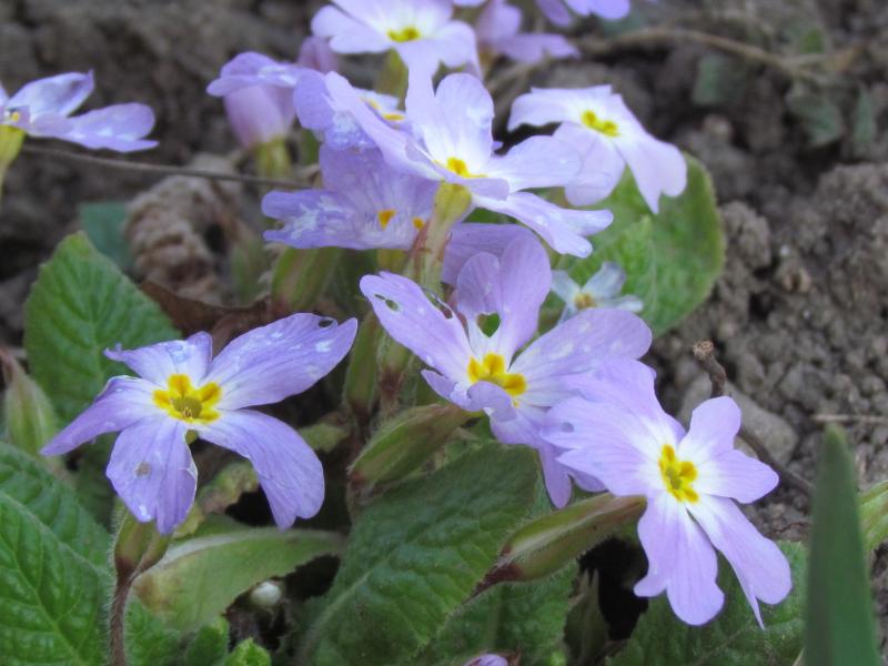 Manche von den Primula vulgaris sibthorpii "Jelitto-Saat" nehmen nach den kalten Nächten wieder einen bläulichen Schimmer an, andere bleiben babyrosa, Vergleichsbild vergessen.