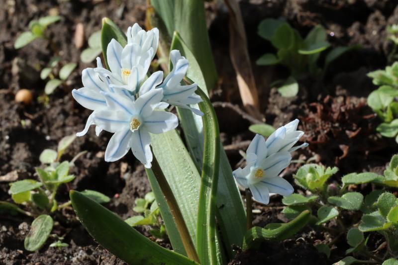 Puschkinien blühen nicht nur später, sondern auch an deutlich höheren Stängeln. Es gibt sehr schöne Auslesen mit vielen und größeren Blüten und weniger ansehnliche. Schneckenfraß habe ich an Scilla, Chionodoxa oder Puschkinia noch nie beobachtet, und das will in meinem Garten etwas heißen!