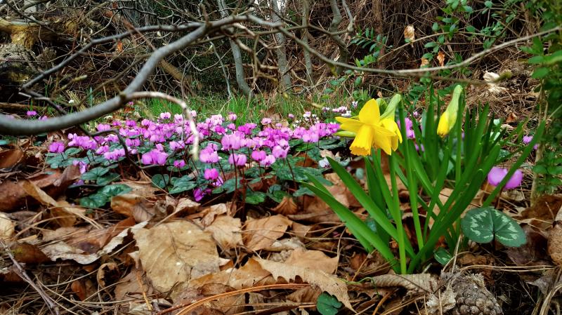 Blüht seit 2-3 Tagen : Narzisse ( Tete a Tete ?), blüht seit Januar : Cyclamen coum