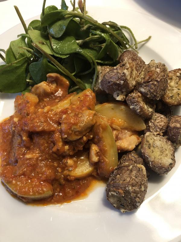 Gestern gab es Gartenzucchini in Gartentomatensoße. Dazu Parmesankartöffelchen und Gartenportulak 8)