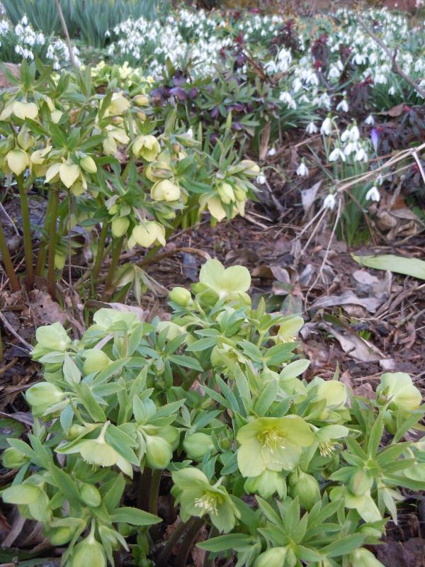 Die Pflanze dazwischen in "fastgelb" hab ich auch als Helleborus torquatus gekauft, aber da hat wohl was anderes mit reingefunkt. Trotzdem hübsch und auch laubwerfend.