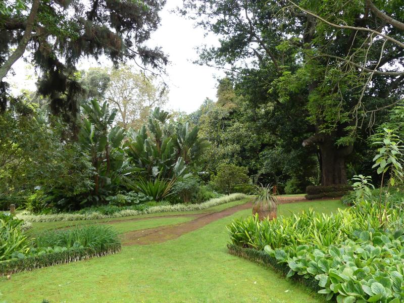 Auf großzügigen Rasenflächen stehen wahre Baumriesen. Rechts Pinus patula, in der Mitte Araucaria bidwillii, links Araucaria excelsa.