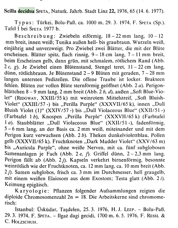 Scilla decidua SPETA. "Franz Speta (* 22. Dezember 1941 in Linz; † 5. Dezember 2015) war ein österreichischer Botaniker. Seine Arbeitsschwerpunkte waren Zwiebelpflanzen, besonders die Hyacinthaceae. Sein offizielles botanisches Autorenkürzel lautet „Speta“." de.wikipedia. ;D Es gibt viele Beispiele für ganz eigene Subspezies in Österreich. Beim gelben Buschwindröschen kam sowas vor.