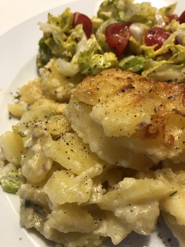 Hautgang .. Fischauflauf mit Kartoffeln drunter, Zwiebeln, Lachs, fette Shrimps und Schollenfiletröllchen drauf, Sahne drüber