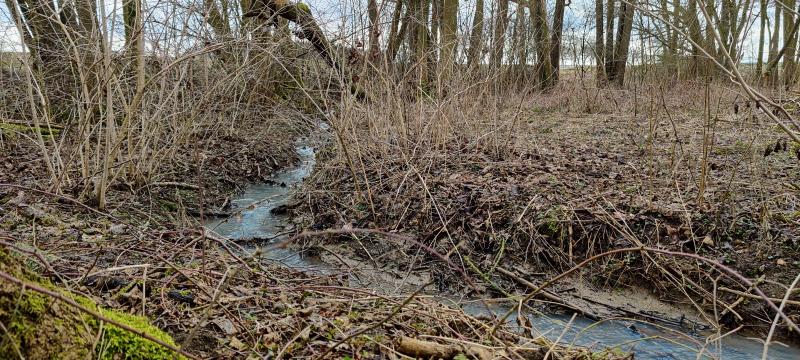 Im recht feuchten Wald befindet sich ein kleiner Bach (ca 30 - 50 cm breit, ca 10 cm tief) - der Abfluss einer Sammel-Drainage der oben liegenden Felder.