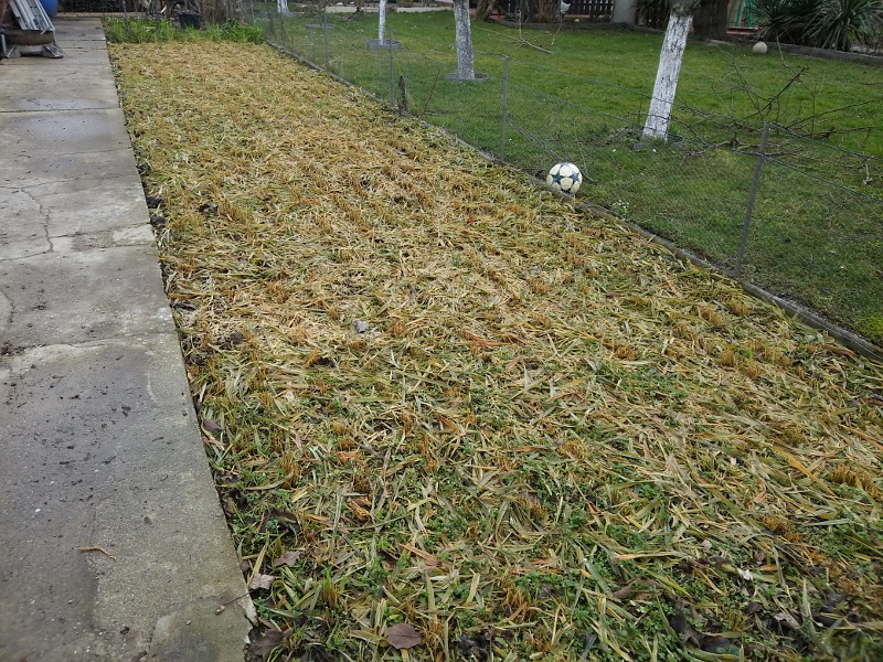 Ansonsten ist der Gründünger eingearbeitet und Kalkstickstoff arbeitet gerade gegen die Vogelmiere vom Winter, gestern die Tomatenstangen den Weg entlang gesetzt.