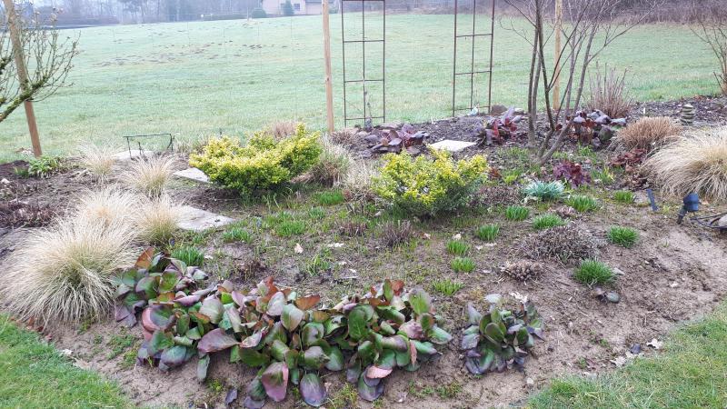 Dasselbe Beet heute. Rechts müsste die Pulmonaria zu sehen sein, vorne die etwas mitgenommen aussehenden Bergenien. Hoffen wir auf die nun angekündigten Sonnentage... :-*