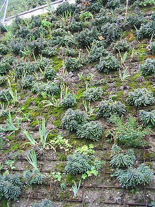 Vor wenigen Tagen sah ich eine recht ansprechende und vor allem ungewöhnliche Lösung für einen sehr steilen Hang im BoGa Trautmannsdorff/Meran.Die Bepflanzung (die steile Wand war durch eine Stahlmatte befestigt) bestand aus Euphorbien, Bartiris und Storchenschnabel. Müsste, wenn sich die Pflanzen erst einmal ausgebreitet haben, recht attraktiv aussehen.