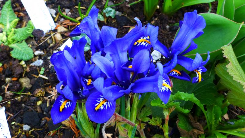 Iris reticulata 'Katherine Hodgkin' die blaue im Vordergrund könnte eine ? sein. Leider gibt mein Fotoapparat diese Fabe nicht so gut wieder denn sie geht ins lila oder ganz dunkles Blau über.