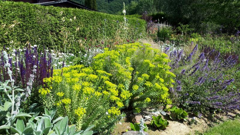 Wenn die Euphorbien im Frühling blühen, habe ich immer das Gefühl, es sei Sommer. myrsinites mit characias, die inzwischen sehr ausladend geworden ist. Mehr liegend als stehend inzwischen die Madame, aber es ist ja zum Glück genug Platz.