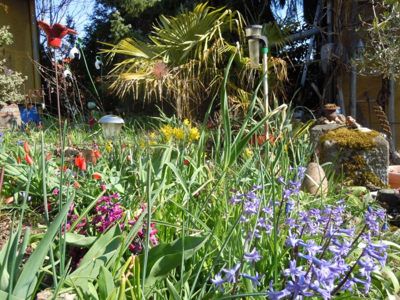 Momentan lebt die Wüste.Man sieht den Boden nicht, vor lauter Geophythen. Leider steckt noch die defekte Solarlampe im Weg rum und der leere Regenmesser zeigt schon Richtung Sommer. Obwohl es heute noch einzelne Schneeflocken hatte und die Nächte frostig sind.