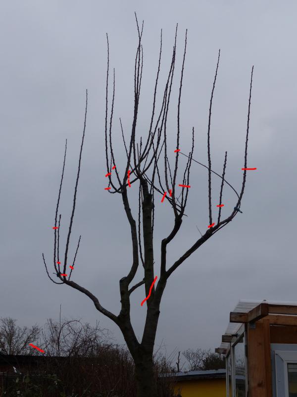 Jetzt habe ich im Februar nur die Leitäste auf ca 2/3 angeschnitten, sonst nichts. Es sind relativ viele Blütenknospen an den kurzen Trieben, sodass ich hoffe, dass diese nicht mehr stark austreiben werden, sondern sich der Austrieb auf die gewollten Leitäste konzentriert.