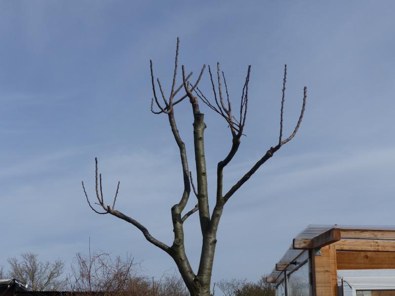 Leider sieht das Ding jetzt erstmal sehr nach Besen aus. Da der Baum recht hoch ist (Kronenansatz ca. 2-2,5m) möchte ich ihn nicht noch viel höher wachsen lassen. Er hat ordentlich "Wumms" und wird dieses Jahr sicher ordentlich nachschieben. Dass es auf die Dauer ein hoher Hochstamm wird, ist klar. Ziel der Kronentwicklung soll sein, ihn auch in die Breite wachsen zu lassen und wenigstens etwas Struktur reinzubringen