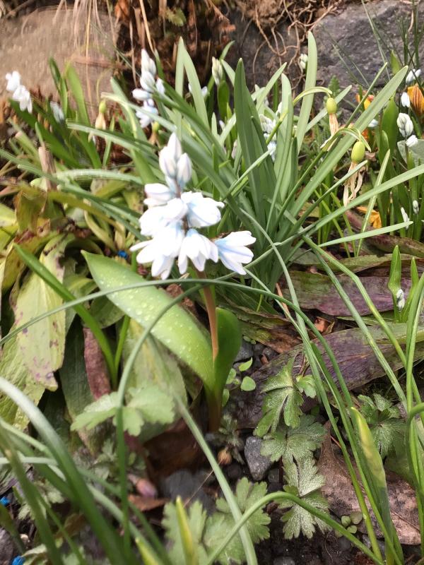 In meinem Steingarten beginnen jetzt die Puschkinien zu blühen, im weiteren Sinne vielleicht auch ein Blausternchen. Ich habe vor einigen Jahren einige wenige Zwiebeln in den Steingarten gepflanzt. Die Pflanze soll ja aus Gebirgen stammen. Inzwischen habe ich es bereut. Die Ausbreitung ist durch Sämlinge doch sehr stark.