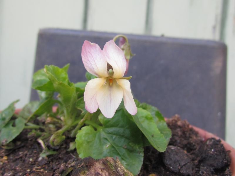 Bei den Getopften zeigt `Crepuscule´ seine erste Blüte, wohl eine (Zufalls)kreuzung aus einem "normalen" und einem der aprikosenfarbenen Viola odorata. Die Form sieht etwas verzogen aus, was anderes als die fünfzigste Nuance der herkömmlichen Veilchenfarben ist es aber allemal!