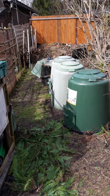 Heute habe ich ein Foto gemacht. Rechts die drei Kompostjungs ;), dahinter stehen jetzt - abgedeckt - Behälter mit Pferdemist, ganz hinten der "große" Komposthaufen, der wird einmal im Jahr ausgesiebt und neu aufgesetzt.