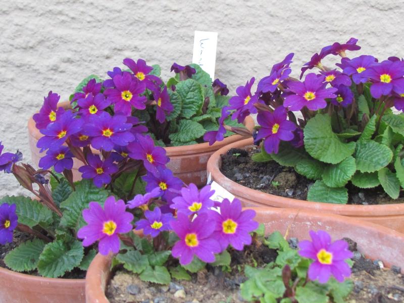 Die Gruppe mit dem dunklen Laub nennen sich Cowichan-Primeln.