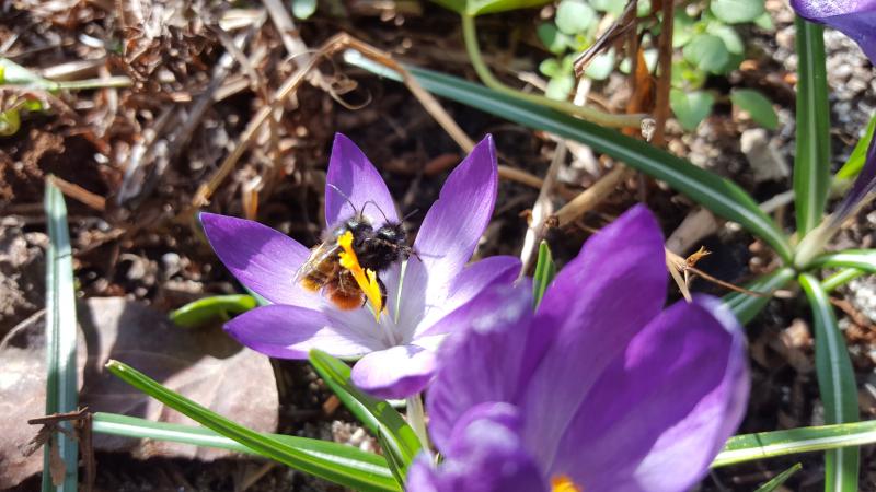 Jetzt gerade in der Wärme sind sie auch wieder fleißig und es sind inzwischen auch mehr als das eine Weibchen unterwegs. Ich habe sie auch in meinen kleinen Vorgarten mit Primeln, Scilla und Krokussen verfolgt. Zumindest die Restblüte der Krokusse scheint ganz interessant zu sein, an den Primeln und Scilla habe ich sie (noch) nicht gesehen. Leider sind die Krokusse eher schon am Verblühen.