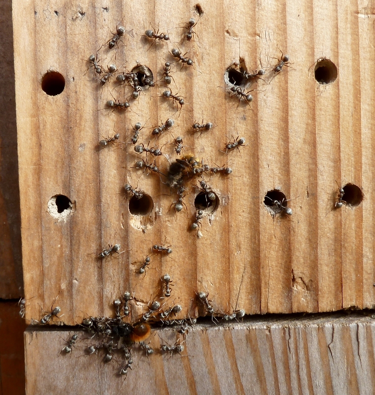 Jedes Jahr dasselbe, überall an den Nisthilfen, egal, in welcher Ecke des Gartens sie stehen. Sobald es warm wird und sich die ersten Wildbienen zeigen, werden auch die Ameisen aktiv.