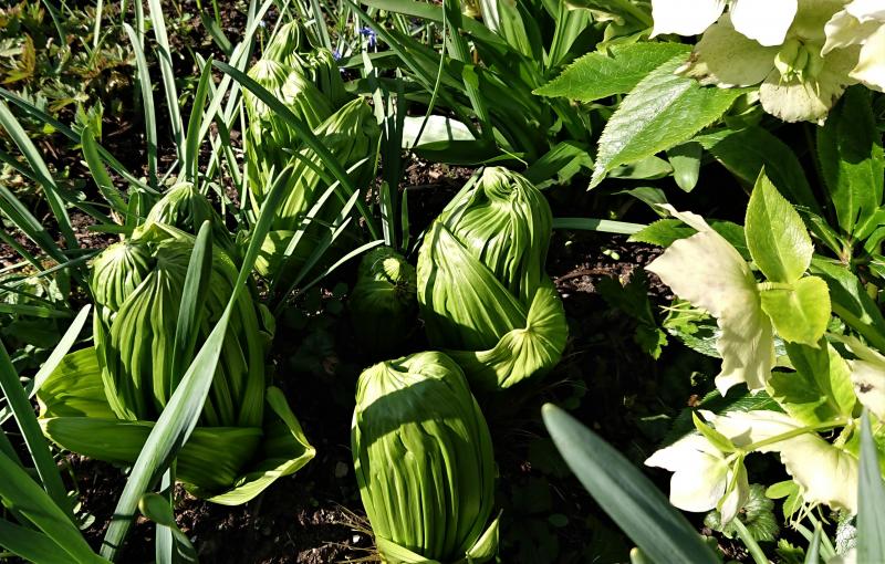 Der Weiße Germer beginnt seine plissierten Blätter auszubreiten; toll, dass es dieses Jahr sechs statt vier Triebe werden!