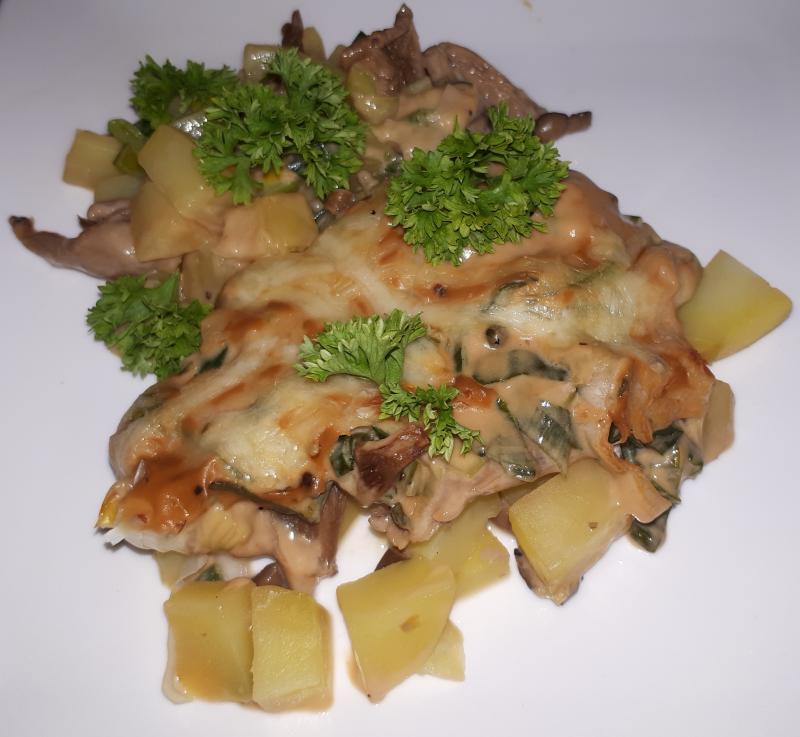 Kartoffeln, Porree und Austernpilze überbacken, Gurkensalat
