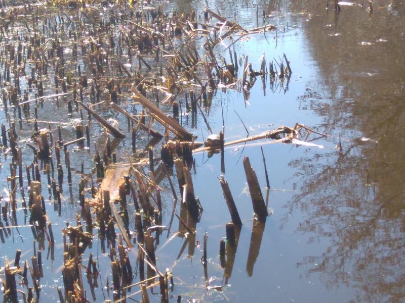 Zu den vielen Kröten und Fröschen hat sich eine Schildkröte dazugesellt. Erstmals im Herbst gesichtet, muss jemand unter den Zaun durchgeschoben haben. Den Winter hat sie gut überstanden.