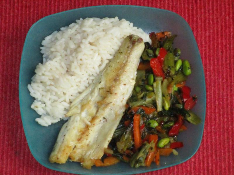 Reis, Wolfsbarsch und Pak Choi-Pfannengemüse (Fertigprodukt)