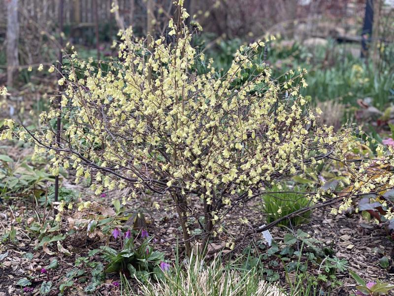 Mein Scheinhasel gibt diese Jahr alles, er leuchtet im Garten wie die Sonne . Darunter machen es sich cyclamen ( leider schon durch...schlechtes timing ) und hundszähne bequem...