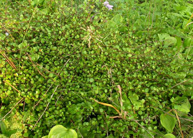 In meinem Garten habe ich Mühlenbeckia axillaris an verschiedenen Standorten. 1. An einem halbschattigen Platz zu Füßen eines Ilex verticillata, rechts und links der Mühlenbeckia je eine große Hosta.Hierhin hatte ich sie gepflanzt, weil ich mir vorstellte, daß es hübsch aussähe, wenn Schneeglöckchen durch das Mühlenbeckia-Polster wachsen würden.
