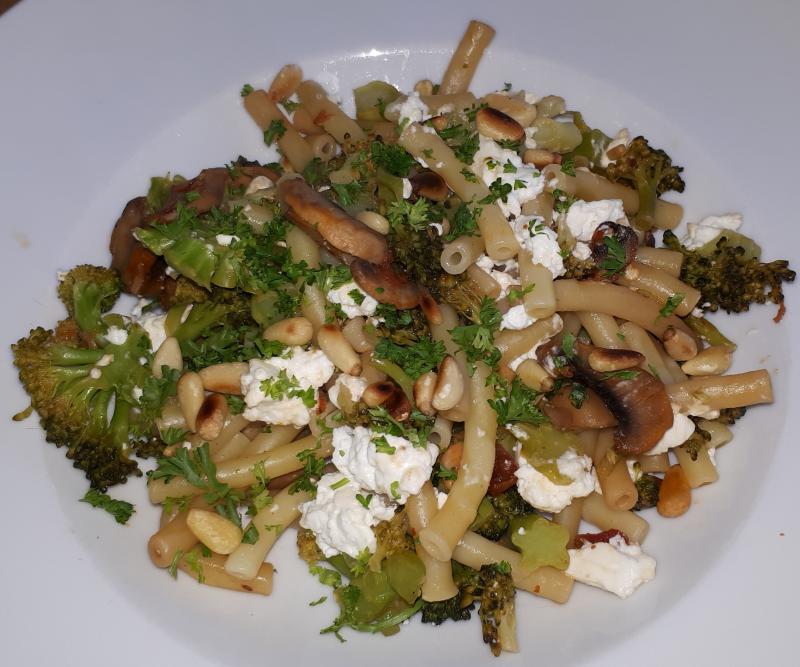 Maccheroni mit Brokkoli, Champignons, Tomaten, Schafskäse und Pinienkernen, Endiviensalat
