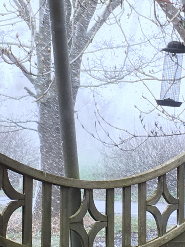 Alles Weiß und es schneit weiter, Kontrastprogramm, gestern Frühling, heute Mittag noch 12 °C, jetzt noch 2, Winter.